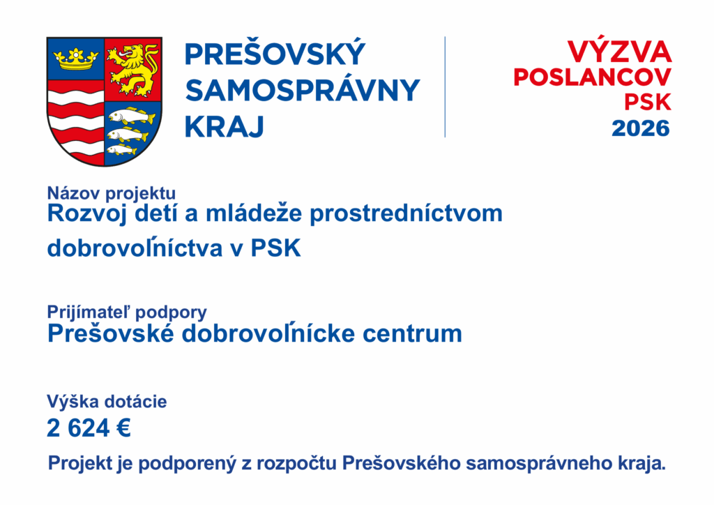 Projekt Rozvoj detí a mládeže prostredníctvom dobrovoľníctva v PSK je podporený z rozpočtu Prešovského samosprávneho kraja.